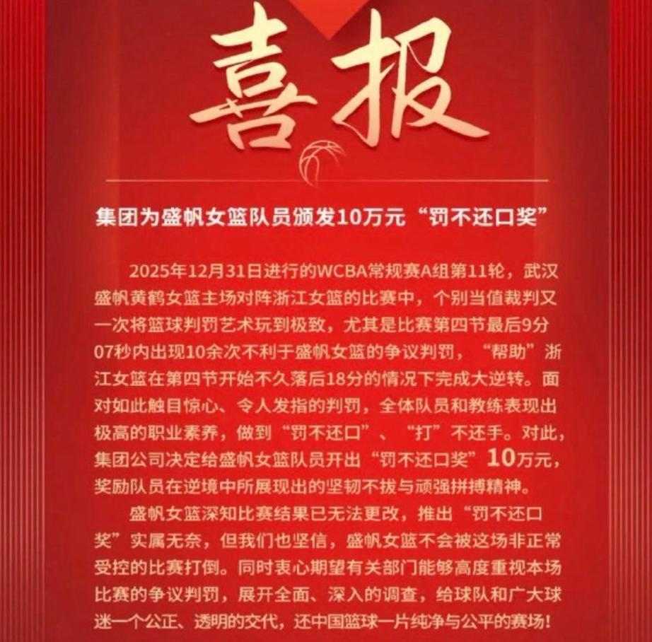 2025年12月31日WCBA第11轮,武汉盛帆女篮遭遇争议判罚,导致输给浙江女篮。赛后,武汉盛帆女篮因球员和教练在争议判罚中保持"罚不还口""打不还手"的职业素养,特奖励全队10万元。此举旨在肯定球员精神,同时表达对裁判工作的强烈不满。